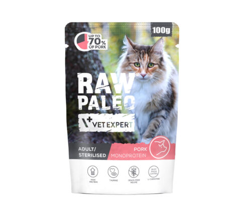 RAW PALEO Pork Adult/Sterilised is a complete feed for adult cats from 1 year of age.